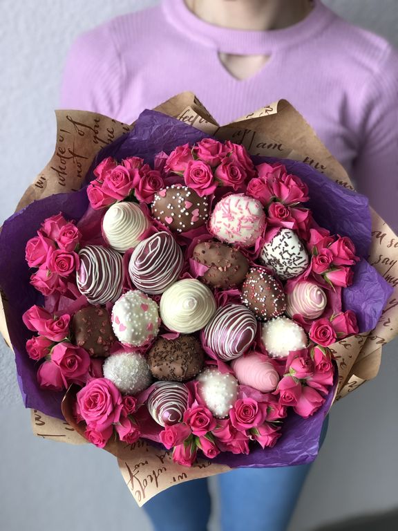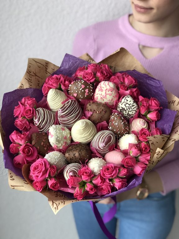 19 крупных клубник в натуральном бельгийском шоколаде, окруженных шикарными кустовыми розами! Диаметр букета 25-27 см. Цвет роз и упаковки может меняться на усмотрение заказчика, и исходя из наличия цветов.