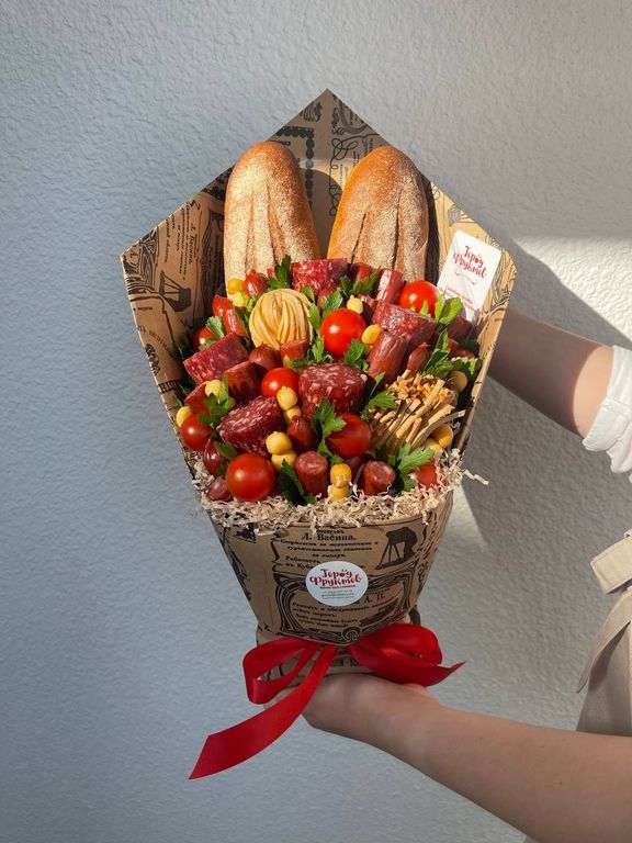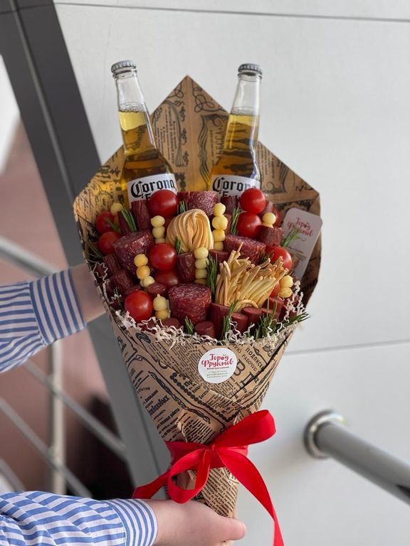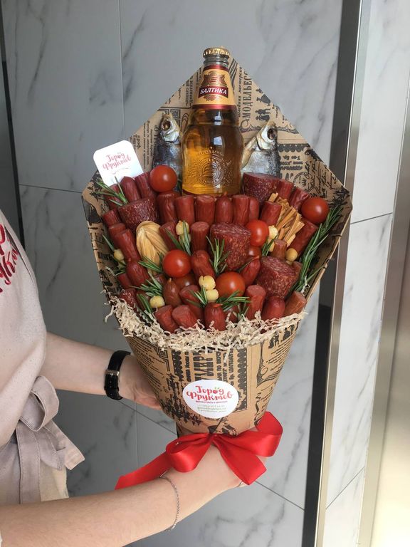 Состав: охотничьи колбаски, сыр копченый, сыр-косичка, сырокопченая колбаса, помидорки черри, багеты, зелень. Вместо багетов можно добавить напитки, оплачиваются по чеку дополнительно. Или заменить на сухую рыбку, плюс 200₽