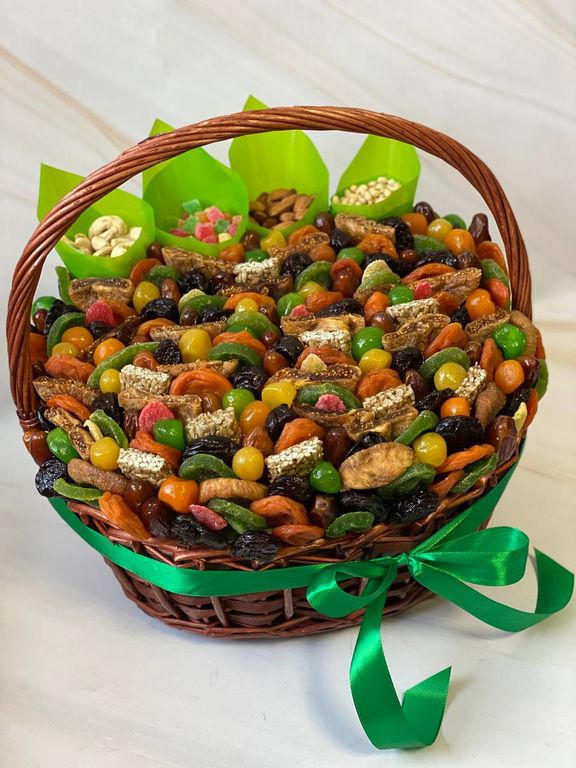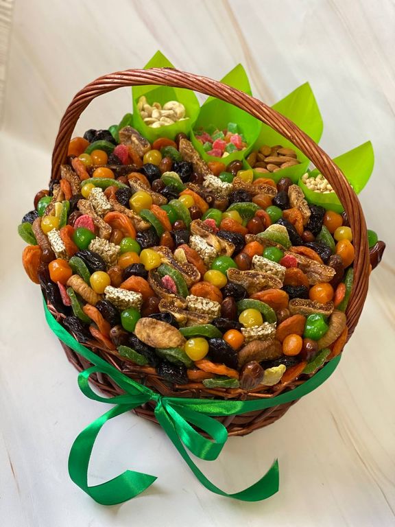 Состав: кедровые орехи, миндаль, кешью, лайм, курага, инжир, чернослив, финики, оранжевые кумкваты, козинаки, лимон, ананас сушеный.