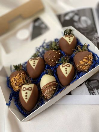 8 клубничек в бельгийском шоколаде в стильном исполнении, специально для мужчин-сладкоежек! В качестве украшения используются сахарная посыпка, вафельная крошка.