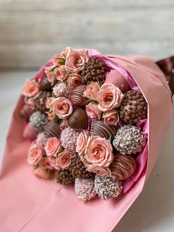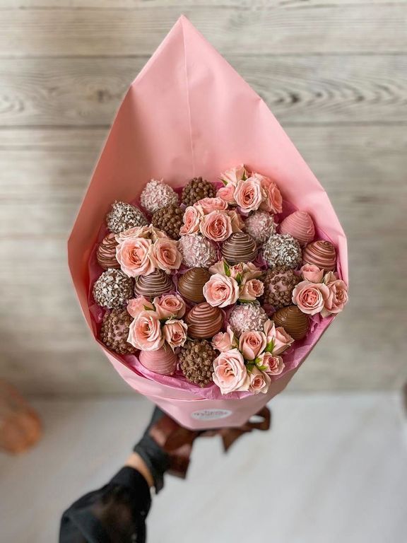 Конверт с клубничкой в бельийском шоколаде, 20-21 шт, и нежно-розовыми кустовыми розочками!