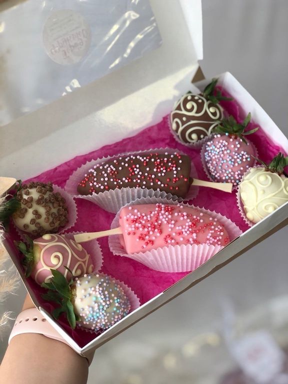 Невероятно нежный микс из 6 клубничек и 2 бананов в белом, розовом клубничном и молочном бельгийском шоколаде!