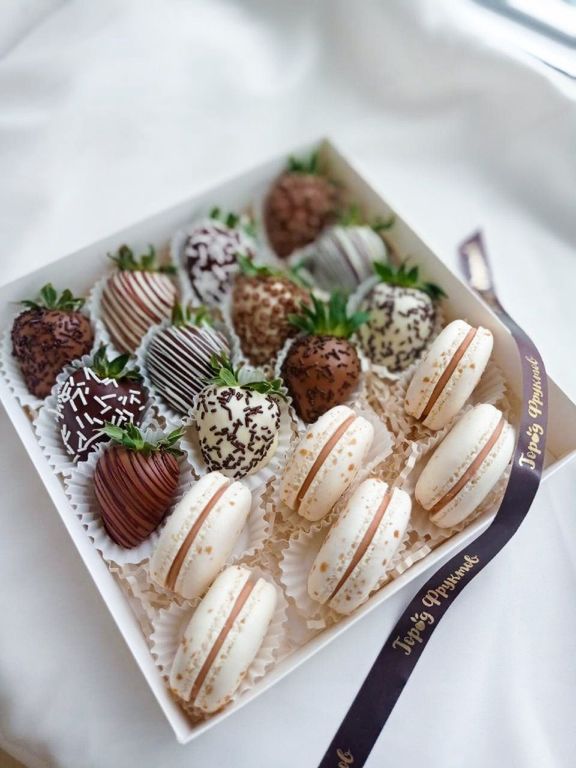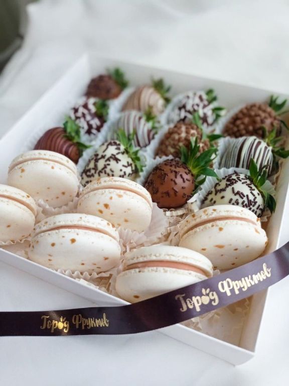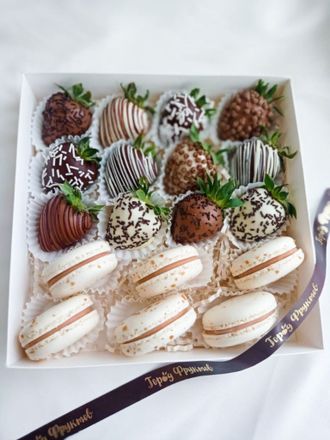 Сладкий бокс размер M. Состав: 6 нежных пирожных макарунс и 12 клубничек в бельгийском шоколаде.