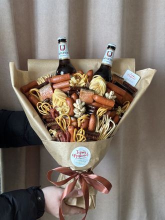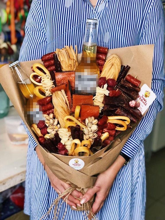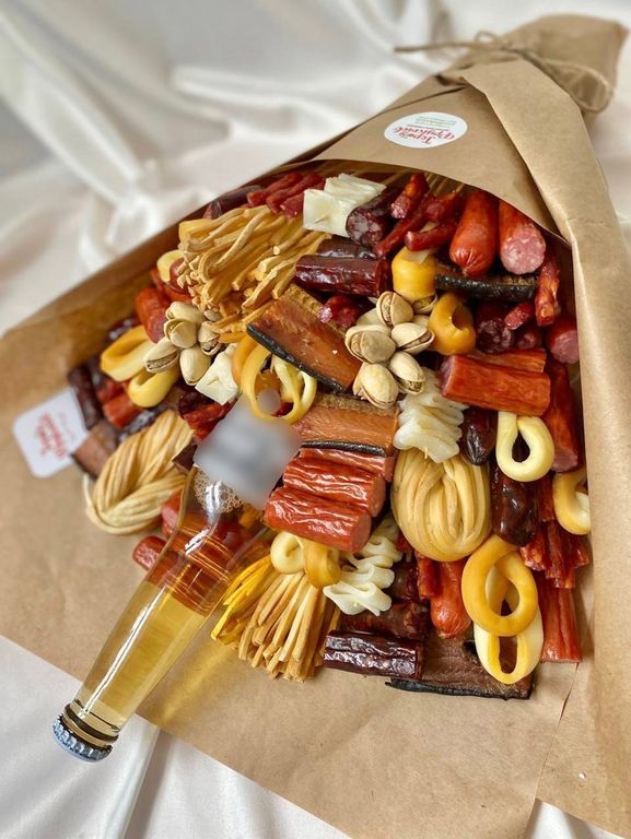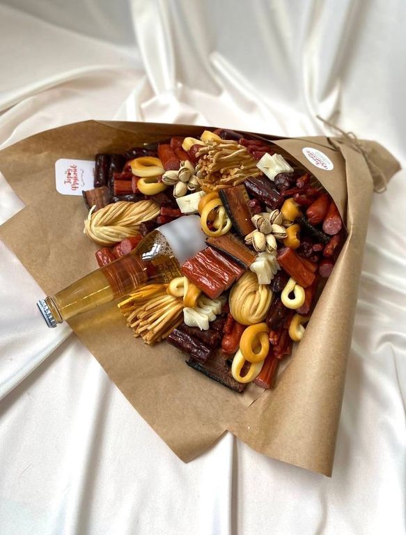 Состав: сыр косичка, сыр чечел копчёный, 2 вида охотничьих колбас, копчёная горбуша, мясные снеки, кальмары, фисташки, напиток (может быть любой, не входит в стоимость)