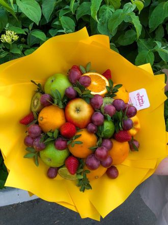 Сочный букет из спелых фруктов: апельсины, мандарин, виноград, сладкая клубника, красные и зелёные яблоки, киви, лайм.