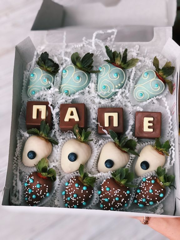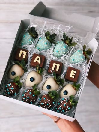 12 спелых клубник в белом и молочном бельгийском шоколаде и буквы-кубики, полностью из шоколада.