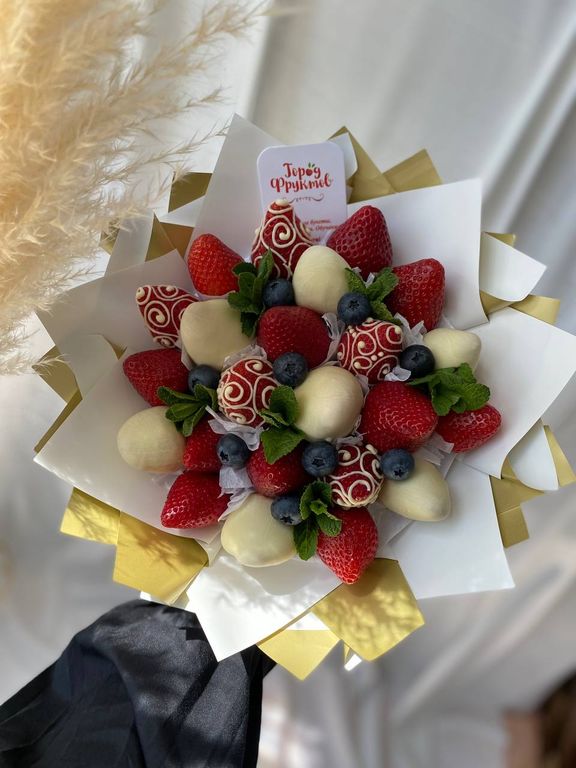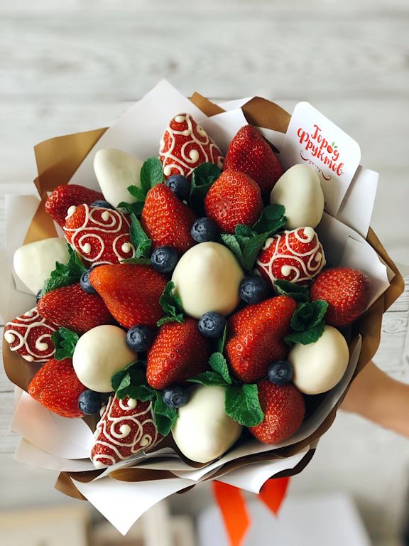 Клубничный букет с кружевными шоколадным узорами на ягодках, используется белый бельгийский шоколад. Букет из 23 отборных клубник, украшен голубикой и мятой. Упаковка может быть заменена, на усмотрение флориста или по пожеланию клиента.