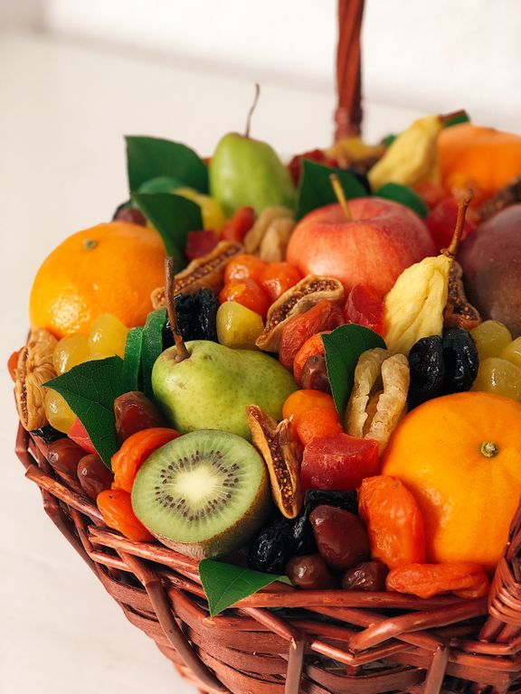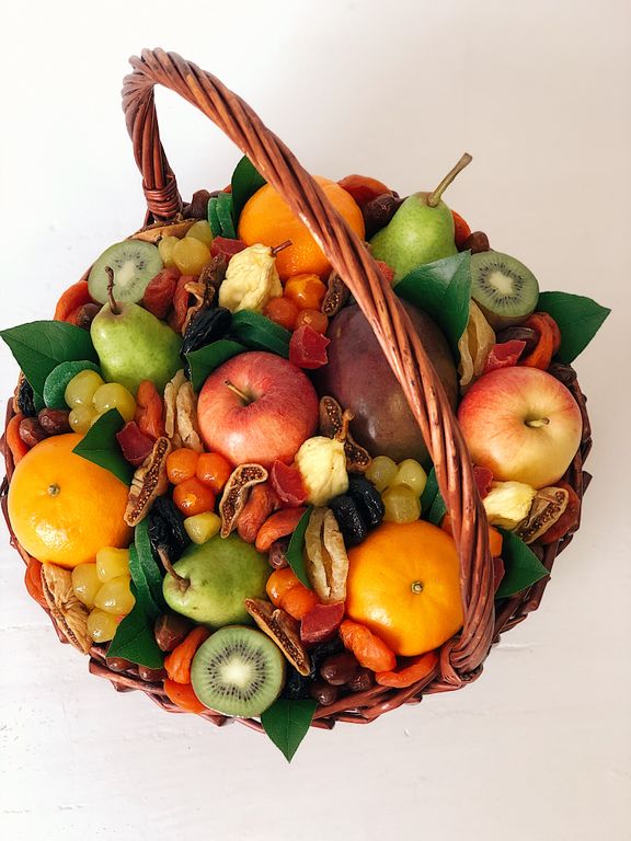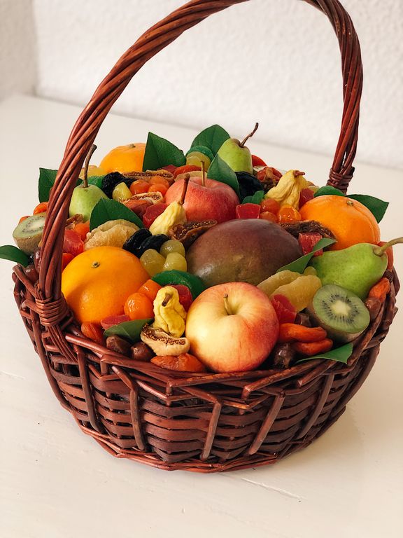 Состав: свежие груши и яблоки, мандарины, киви, манго; инжир, курага, финики, вяленые лимоны и мандарины, ананасовые кольца, груши вяленые, сушёные киви, папайя. Диаметр корзины 30 см