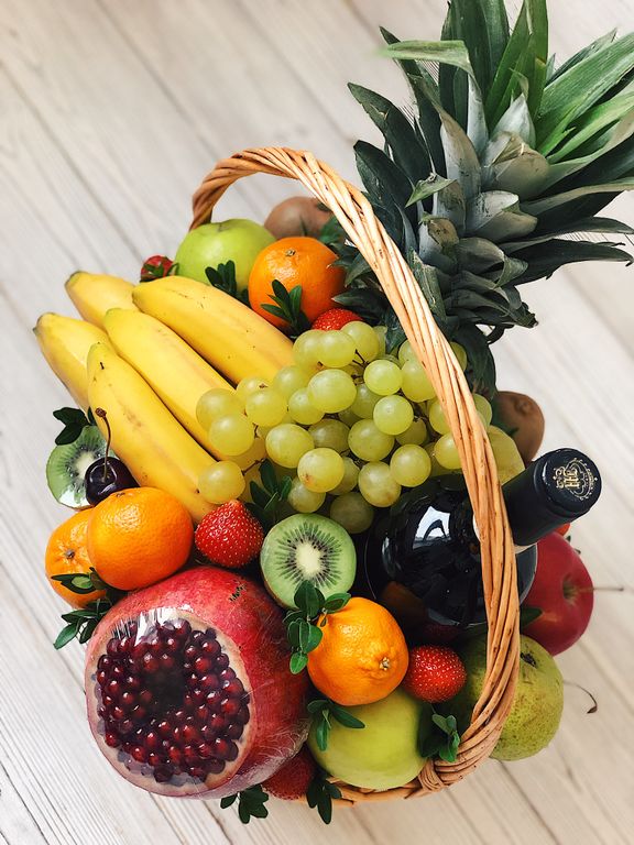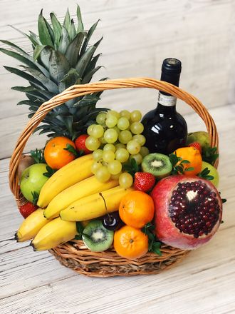 Праздничная корзина с ананасом, гранатом и сезонными фруктами: киви, мандарины, яблоки, груши, апельсины, виноград, клубника, черешня по сезону. Вес более 4 кг.