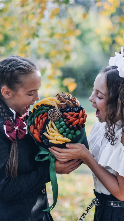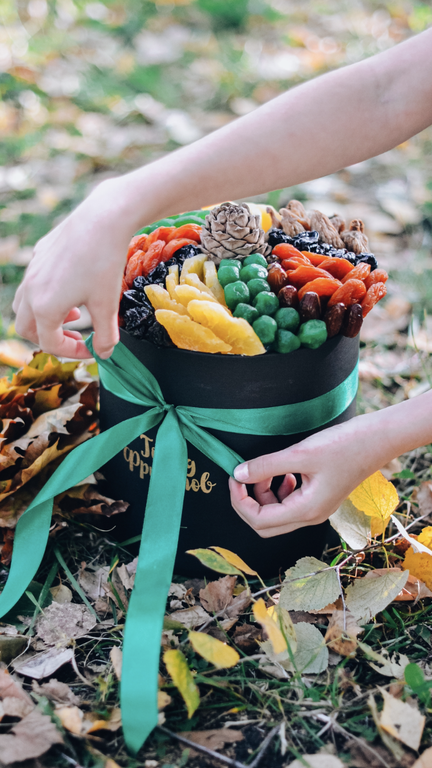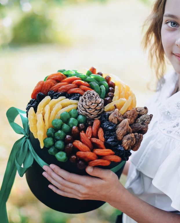 Киви, курага, лайм, чернослив, инжир, ананасы, финики, кедровая шишка.