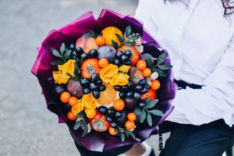Яркий контрастный букет из фруктов, диаметр 30 см. Состав: инжир, слива, апельсин, хурма, имбирь, персики или мандарины, виноград, физалис и живые цветы