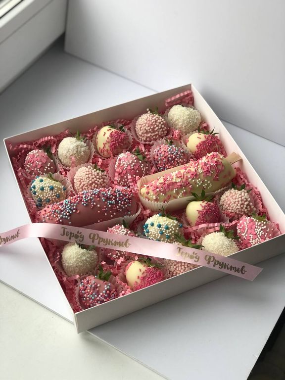 20 отборных клубничек и 2 банана в белом и розовом клубничном бельгийском шоколаде.