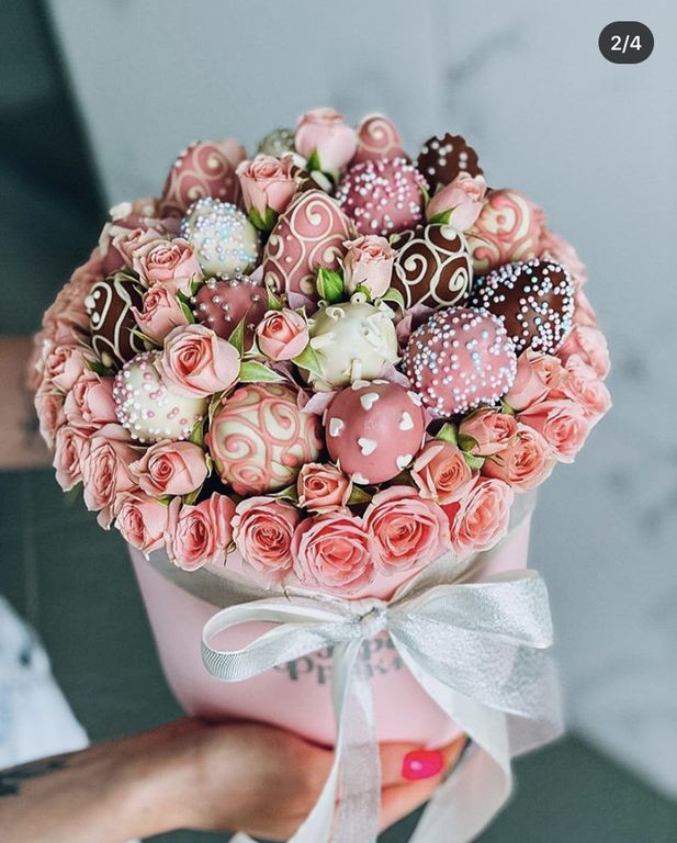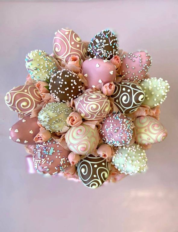 Спелая клубника в бельгийском шоколаде 18-19 шт в росписи и посыпке, окружённая кустовыми розочками!