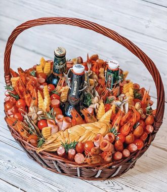 Состав корзины: раки, креветки, охотничьи колбаски 2 вида, ветчина, сыр, сыр косичка, фисташки, помидорки черри, зелень, рыбка сушхая.