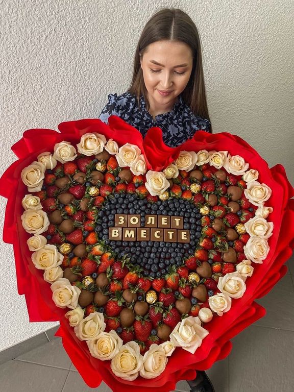 Состав: 35 роз, ферреро, голубика, буквы-кубики из бельгийского шоколада