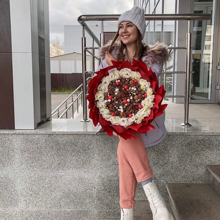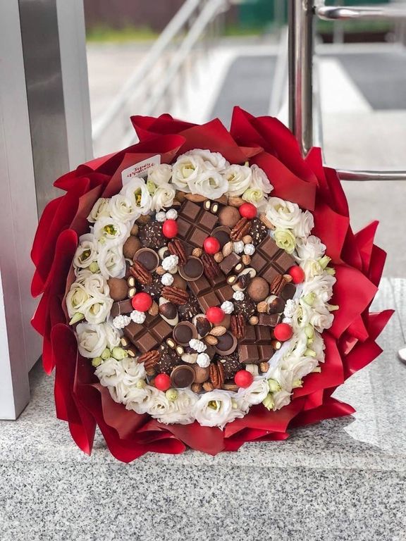 Состав букета: 6 видов конфет, в том числе конфеты toffifee,Ritter sport, шоколадные ракушки, мармелад, орехи пекан, миндаль, арахис в сахарной корочке и живые цветы.