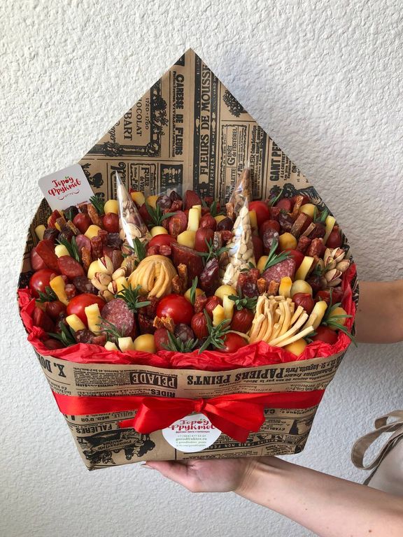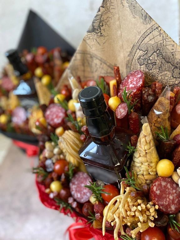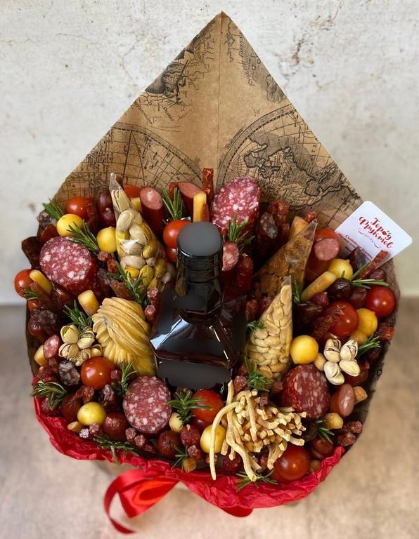 Состав: сыр-косичка, помидоры черри, охотничьи и мини колбаски, сыры нескольких сортов, сырокопченая колбаса, мясной хворост, фисташки, солёный арахис, гренки, розмарин.