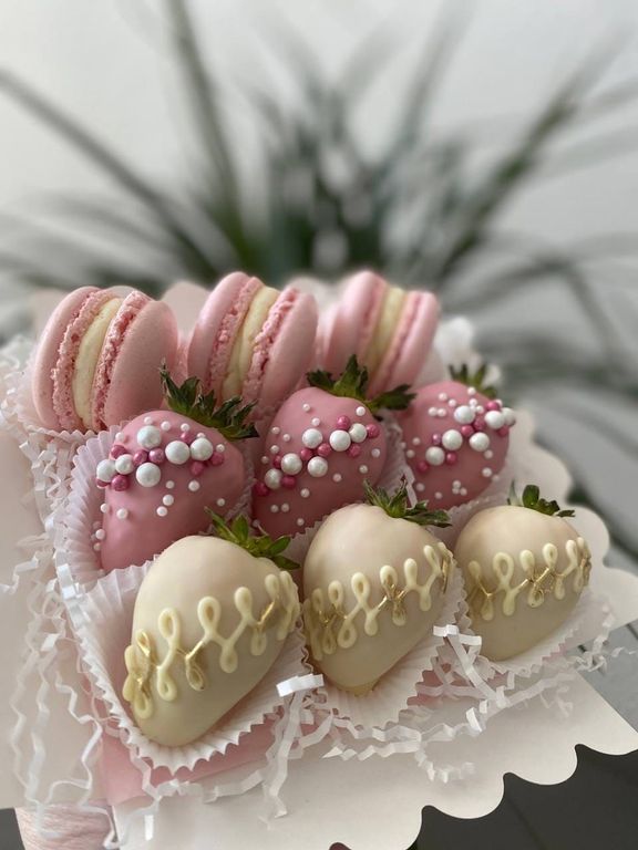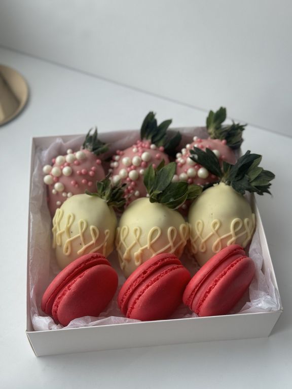 3 нежных пирожных макарон и 6 отборных клубничек в белом и розовом клубничном бельгийском шоколаде.
