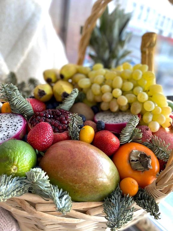 ✔Состав: ананас, мандарины, виноград, апельсины, яблоки, груши, хурма, лаймы, манго, питахайя, маракуйя, кумкват, голубика, клубника, гранат. В зависимости от сезона состав может меняться. Общий вес фруктов - более 10кг