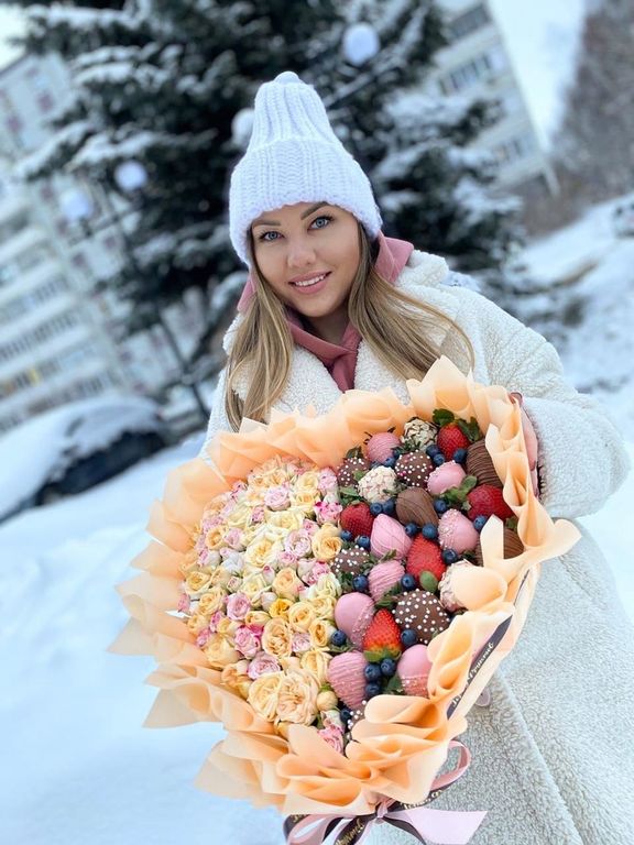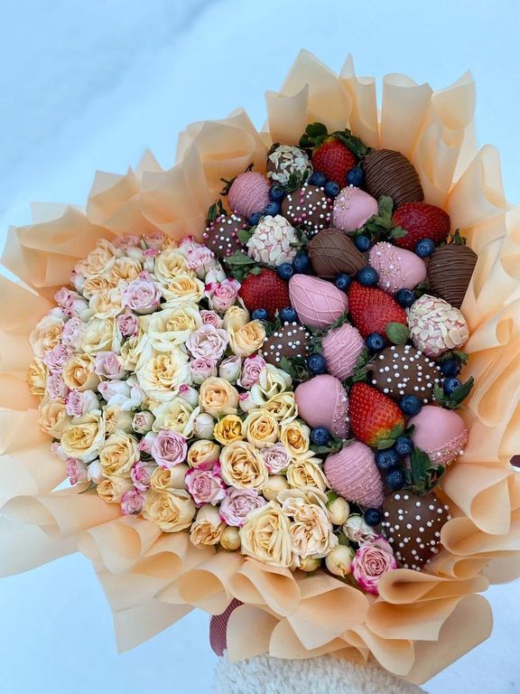 Спелая клубника в бельгийском шоколаде 24 шт в росписи и посыпке, кустовые розочки, голубика, флористическая зелень.