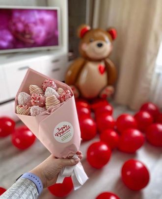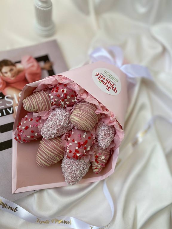 Букет из 10 свежих отборных клубничек в бельгийском шоколаде. Ручная роспись шоколадом и вкуснейшие посыпки!