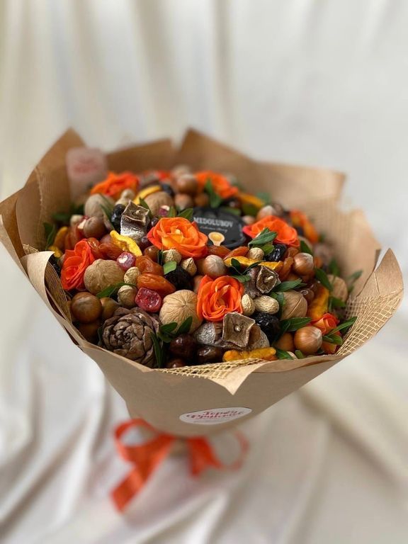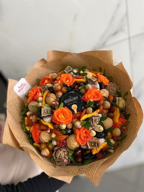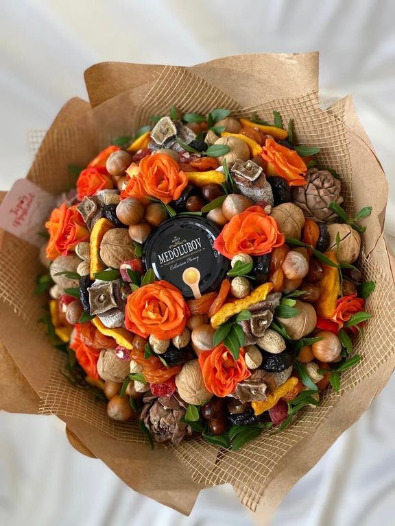 Состав: мёд-суфле, курага, чернослив, финики, персик, кедровая шишка с орешками внутри, вяленая хурма, грецкие орешки, фундук, арахис, розочки и флористическая зелень.
