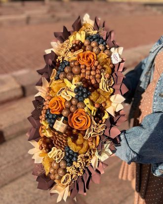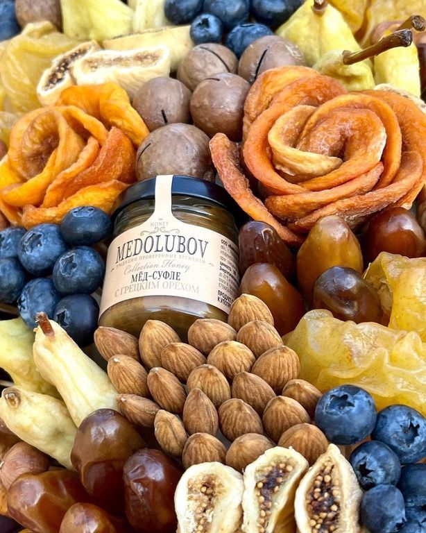 В составе: сушеный инжир, груша сушеная и вяленая, сушеный персик, финики, орех макадамия, грецкий орех, фундук, миндаль, голубика и мёд
