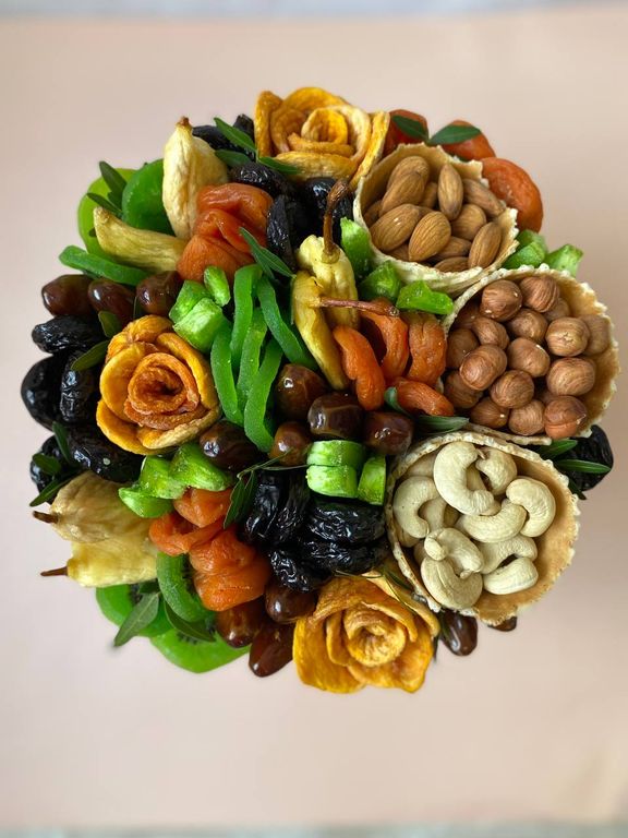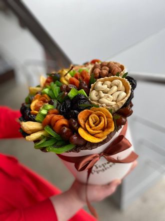 Состав: киви, курага, финики, чернослив, помело, персик, груша с хвостиками, миндаль, фундук, кешью, рожки вафельные, флористическая зелень