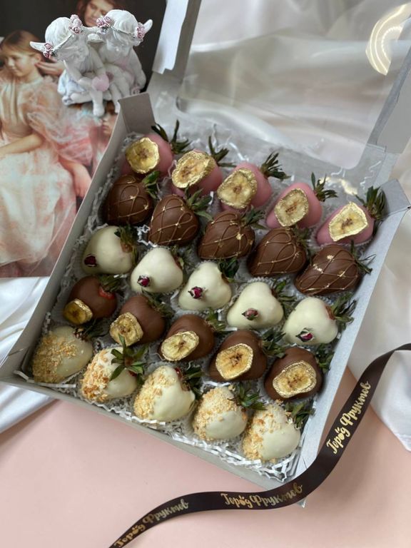 Стильный бокс из 25 клубничек в молочном, белом, розовом клубничном бельгийском шоколаде.