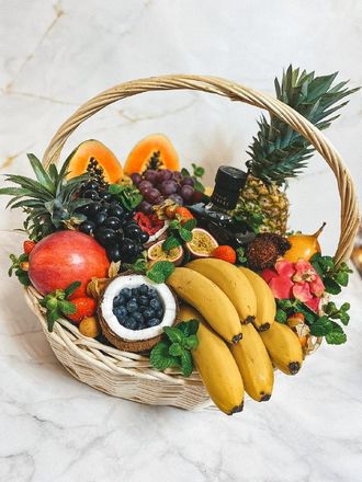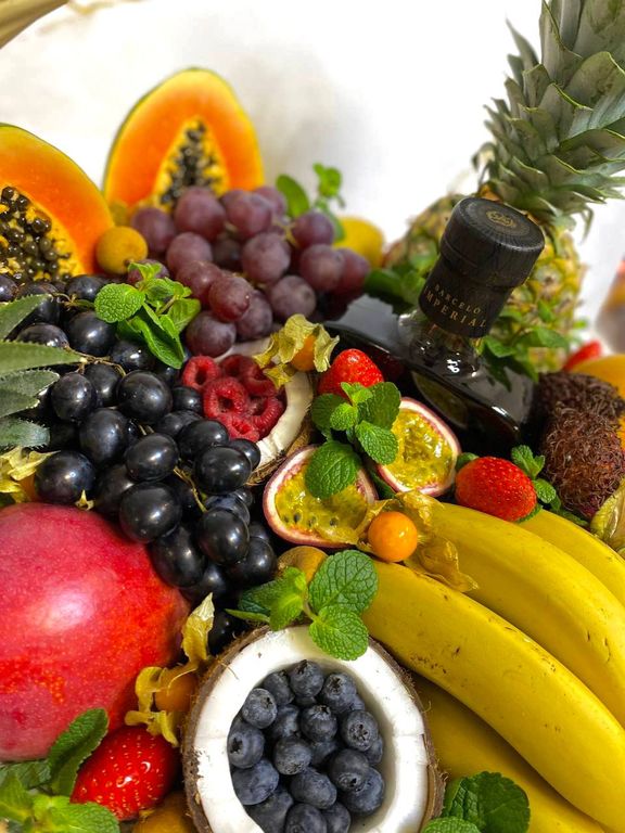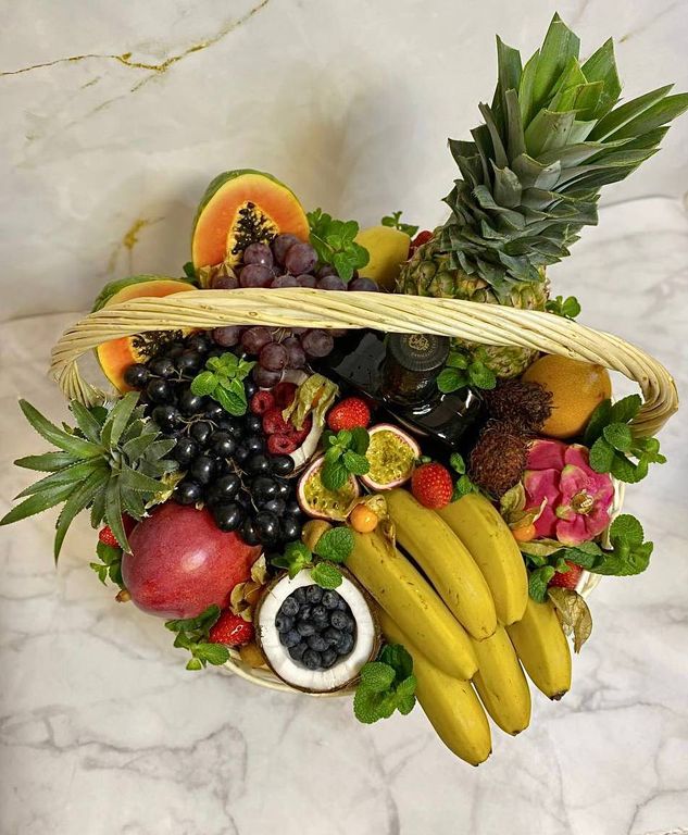 Состав: ананас, кокос, манго, папайя, маракуйя, гранидила, питахайя, лонган, слива, киви, виноград, груши, красные и зеленые яблоки, карамбола, кумкват, физалис, голубика, малина, клубника, мини бананы, апельсины, хурма, мандарины, мята.