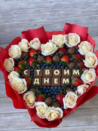 23 спелых сочных клубники, кубики из натурального бельгийского шоколада, голубика и ароматные розы