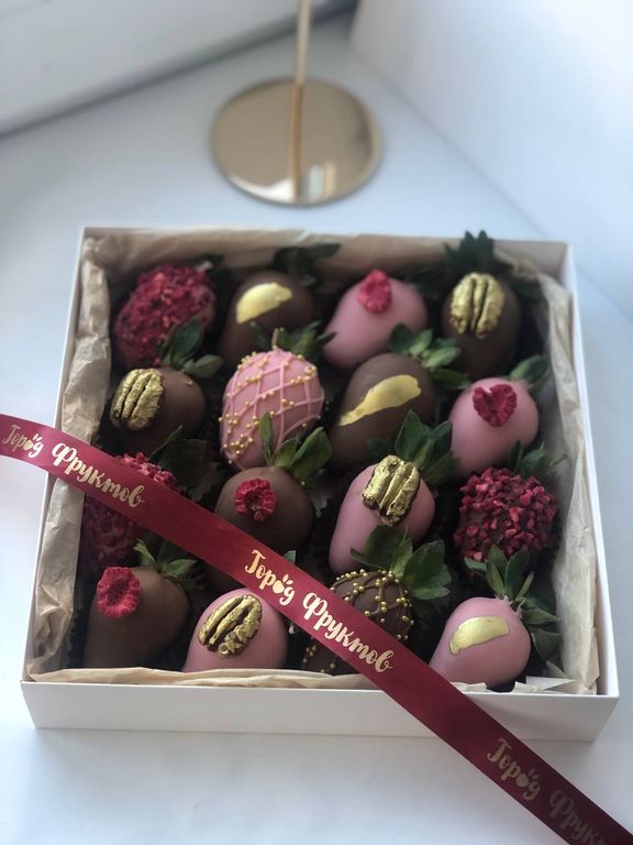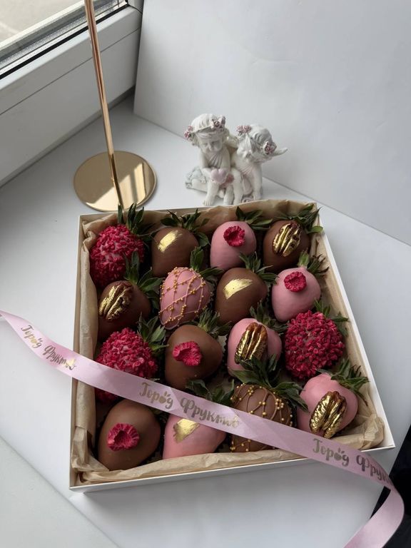 Вкуснейшая клубника в премиальном молочном и розовом клубничном бельгийском шоколаде, исполненная в чарующем дизайне.