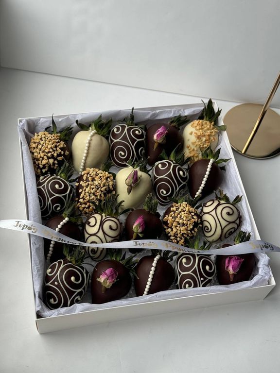 Бокс на 20 клубничек в белом и темном бельгийском шоколаде.