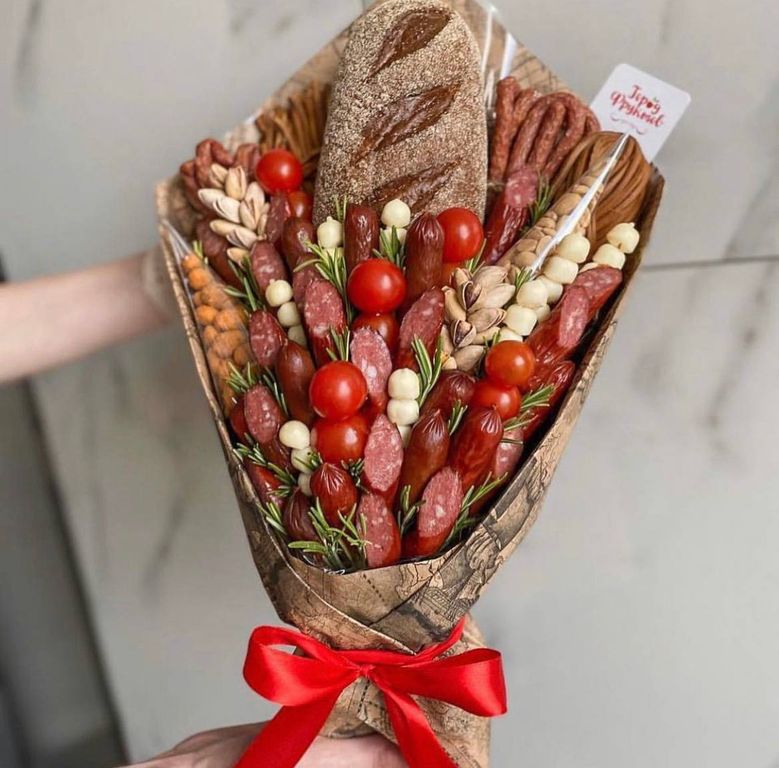 В составе охотничьи колбаски,мясной хворост, сыр копченый, сыр-косичка, фисташки, свежий багет, черри-помидоры и зелень.