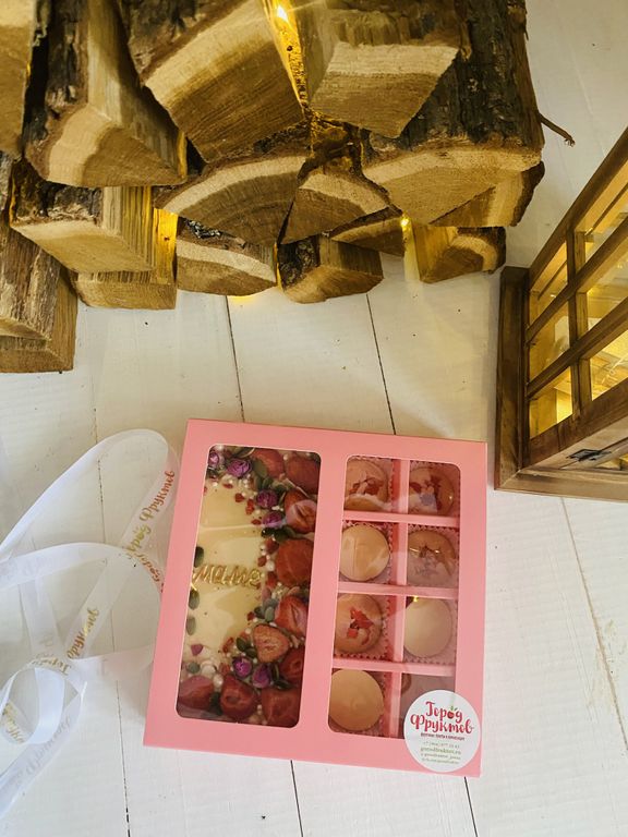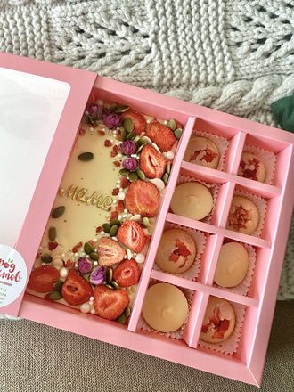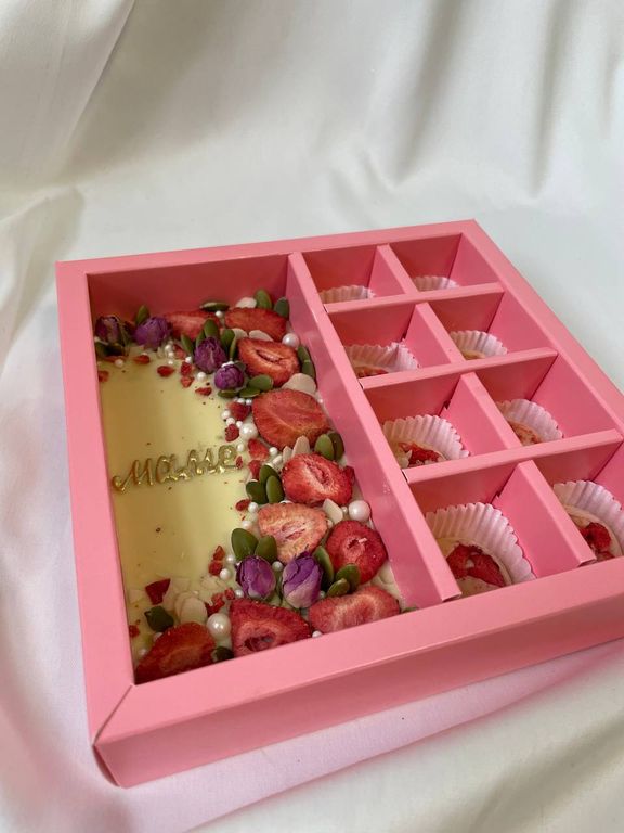 Сочетание нежных оттенков в боксе с шоколадом и конфетами ручной работы приятно удивят любого и точно оставят сладкое послевкусие после праздника! Белый бельгийский шоколад, украшение: сублимированная клубника, малина, сахарные жемчужины, съедобные бутоны розочек, тыквенные семечки.