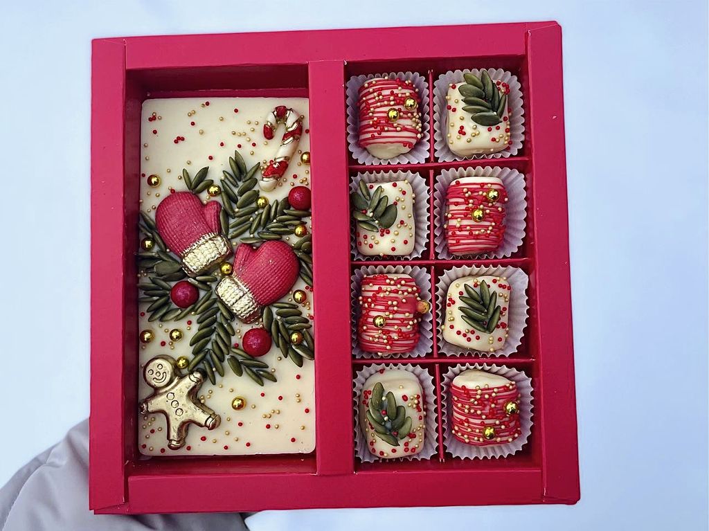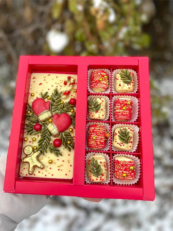 Набор к Новому году из плитки белого бельгийского шоколада ручной работы и 8 маршмеллоу в шоколаде.
