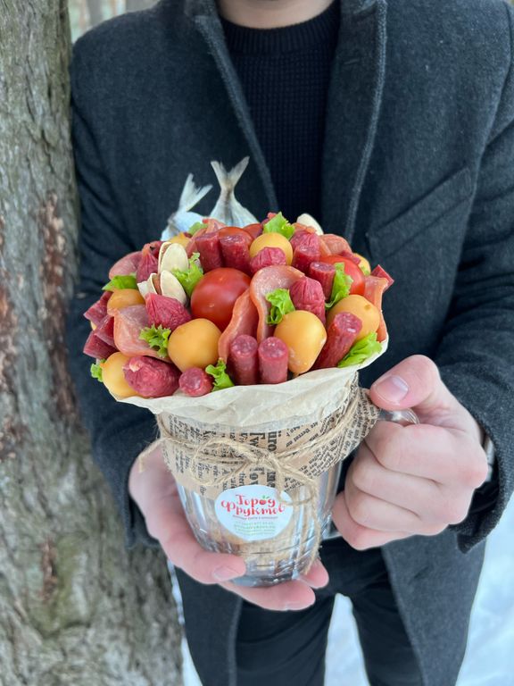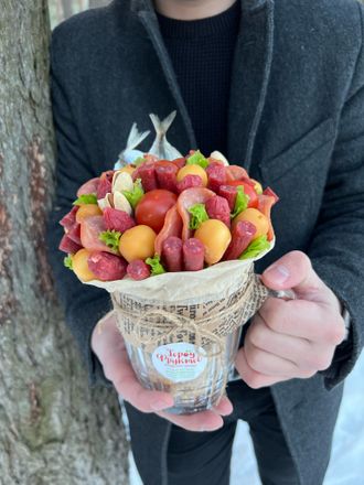 Вкуснейшая композиция в кружке как из СССР, кружка наполнена арахисом в скорлупе, сверху шапка из мясных деликатесных снеков, черри, копченого сыра, фисташек и сушеной рыбки. Вместительный и выгодный формат, кружка останется у получателя и будет его радовать каждый вечер. Количество (очень) ограничено.