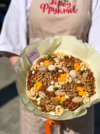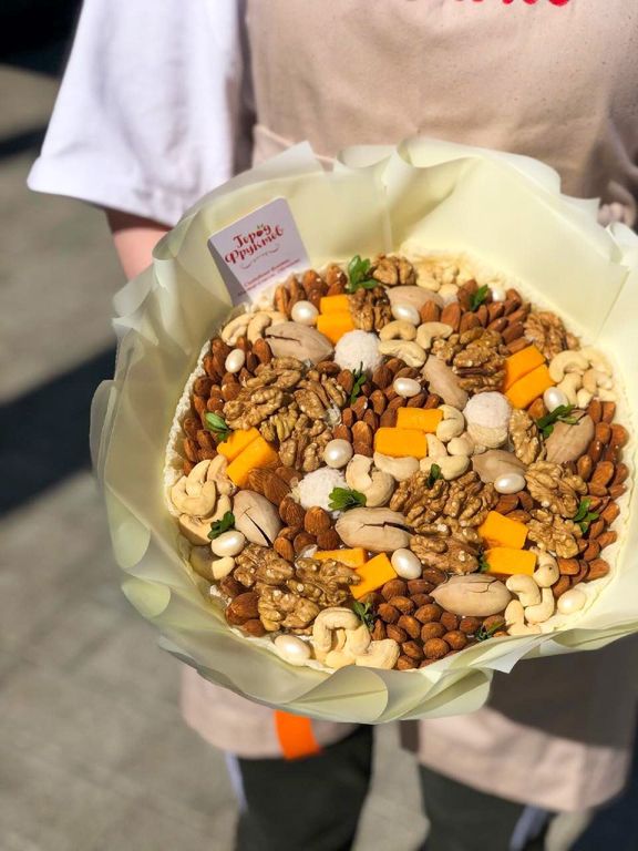 Состав: пекан в скорлупе, миндаль, грецкий орех, кешью, кубики манго, конфеты, арахис в глазури, зелень. Диаметр 22 см.