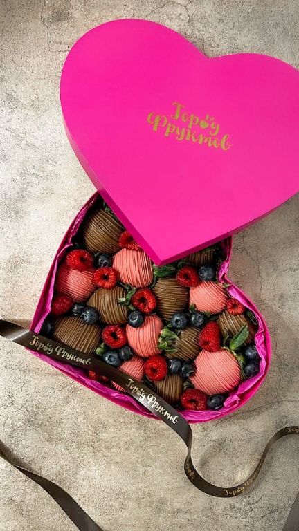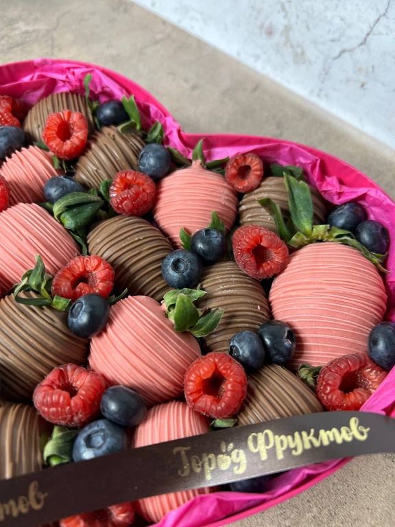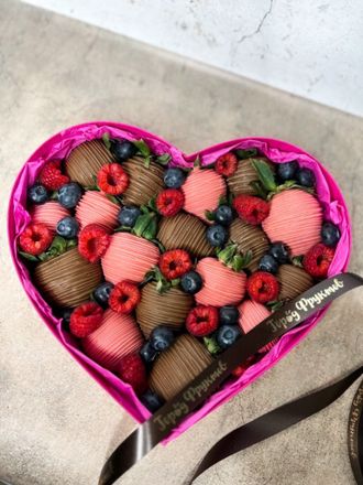 Бокс Сердце с клубникой в молочном и розовом клубничном бельгийском шоколаде, голубикой и малиной.