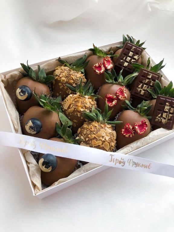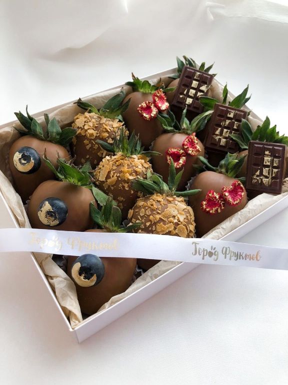 12 ягод в молочном шоколаде с декором из ягод голубики, сублимированной малины, плиток школада и вафельной крошки.