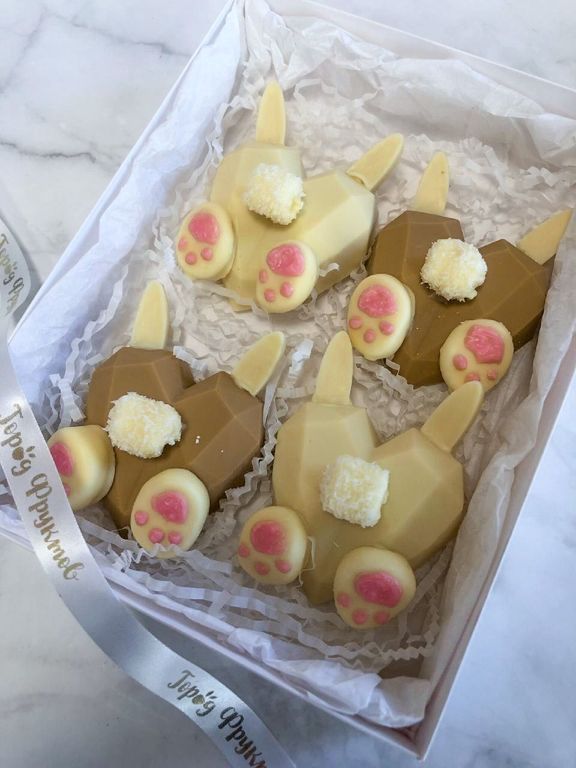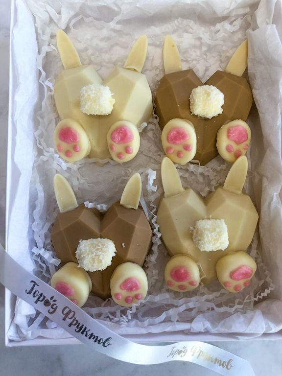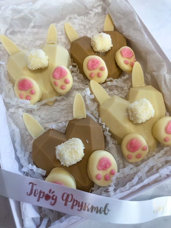 Состав: милые кролики из молочного и белого бельгийского шоколада с орешками, сублимированными ягодами, пишмание