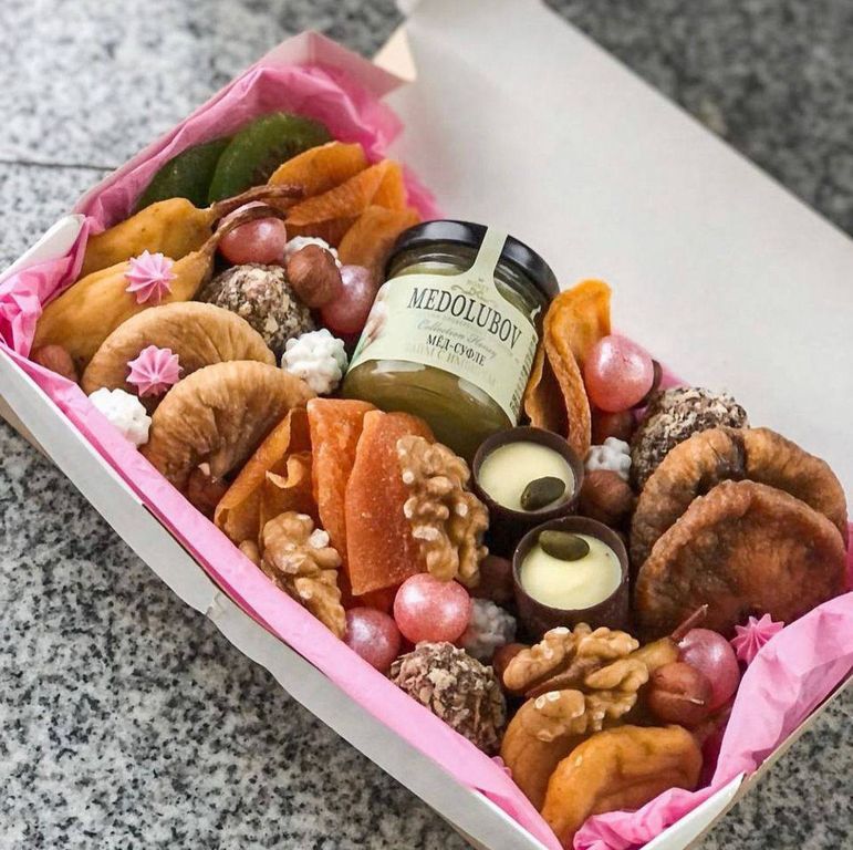 Состав: мед-суфле, конфеты комильфо, вафельные конфеты, киви и груша сушеные, манго, инжир, цукаты, грецкий орех и фундук очищенные, арахис в сахарной корочке и мармелад