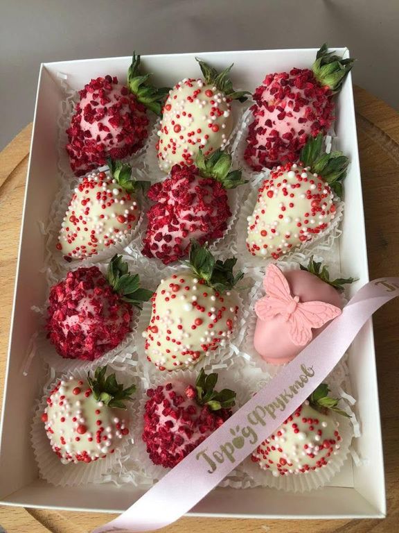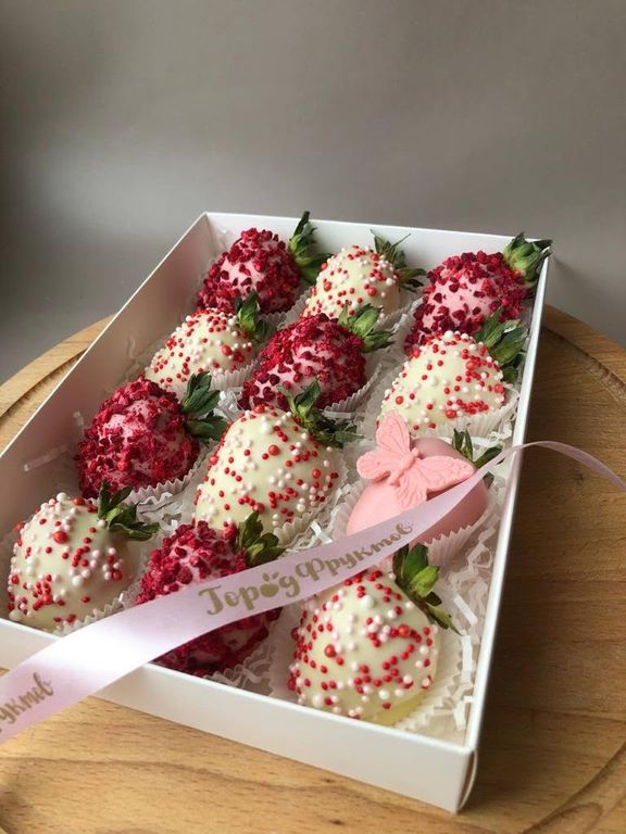 Бокс на 12 отборных клубничек в белом и розовом клубничном бельгийском шоколаде!
