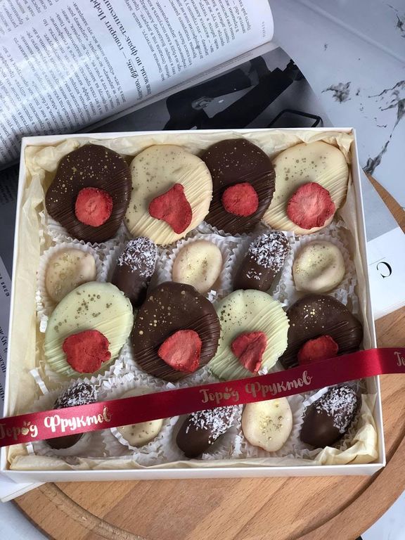 Сухофрукты в бельгийском шоколаде 2690 руб. 2890 руб. Купить в 1 клик В корзину Состав: персик, киви, курага, финики Вес: 412 грамм Размер: 20*20 см Состав: персик, киви, курага, финики Вес: 412 грамм Размер: 20*20 см Комментарии 0 Комментарии 0 Нет комментариев Добавить комментарий
