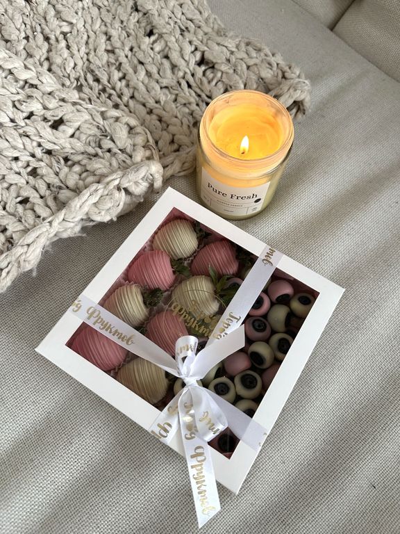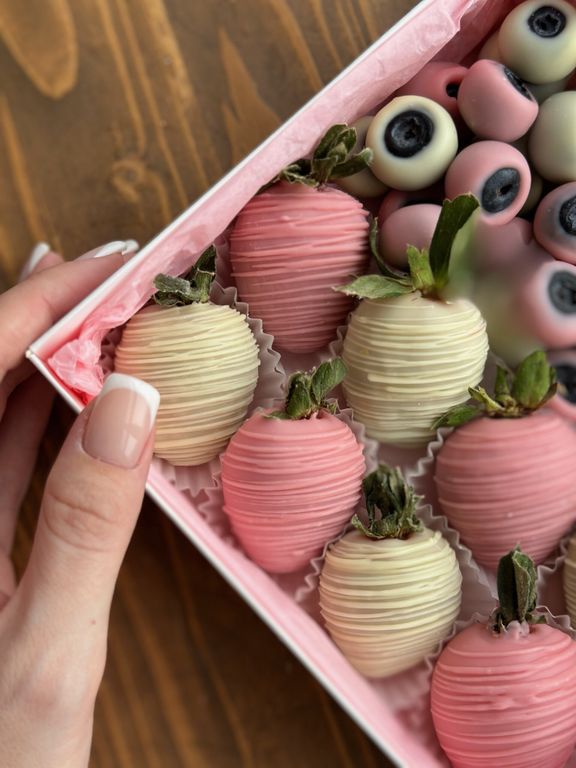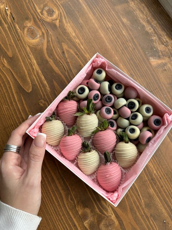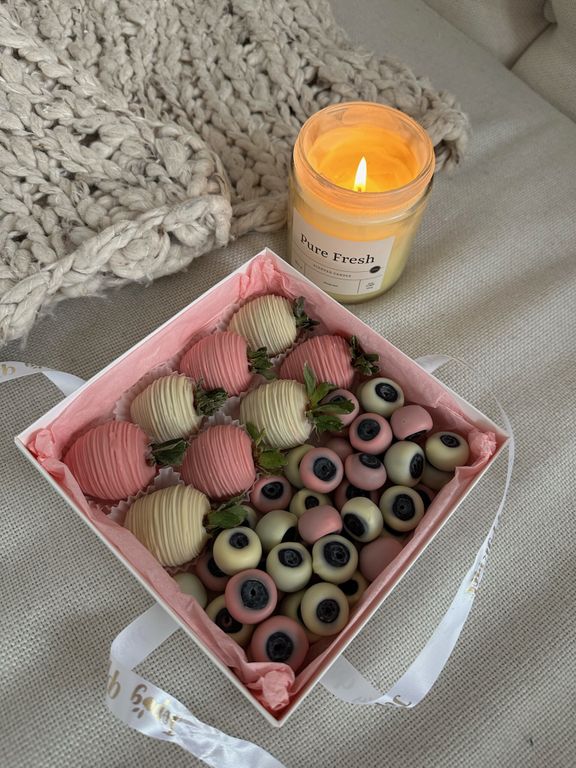 8 отборных клубничек в бельгийском белом и клубничном шоколаде, 160 гр голубики в бельгийском белом и клубничном шоколаде.