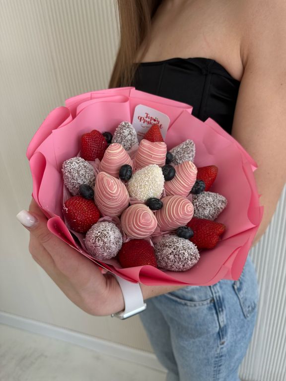 Нежный букет из 19 сочных ягод в белом и розовом клубничном бельгийском шоколаде и голубики.