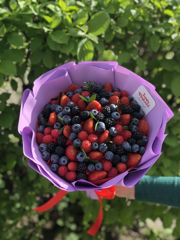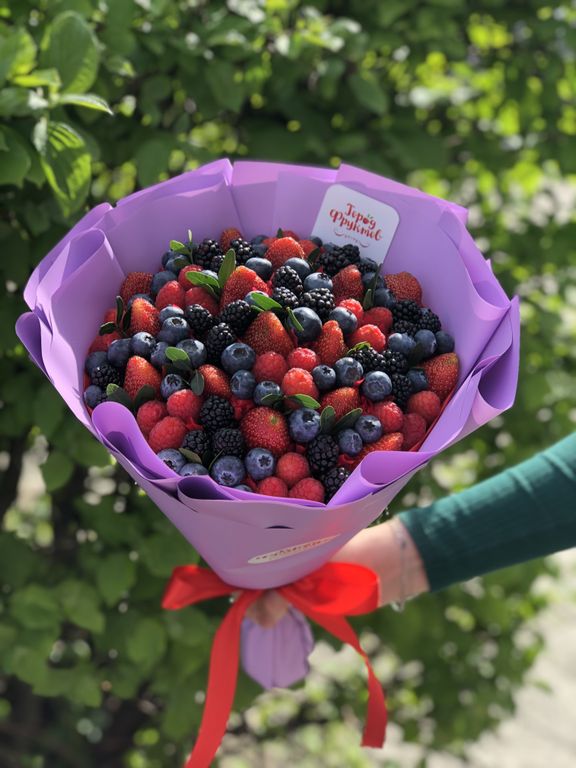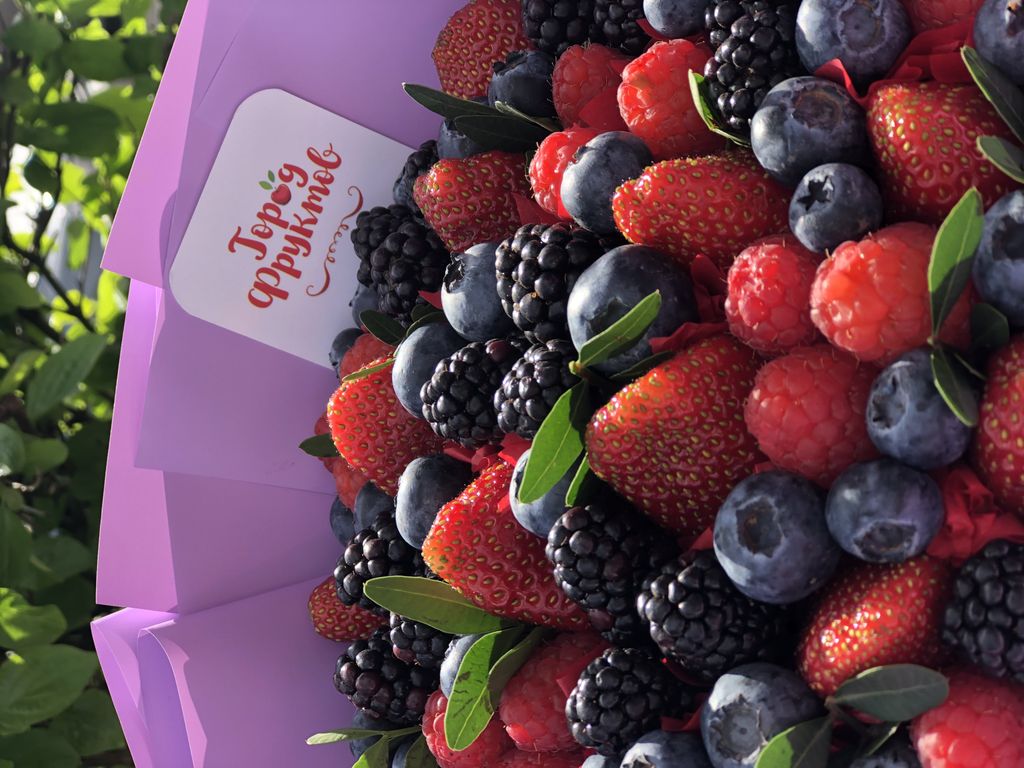 Состав: свежая клубника, малина, ежевика, голубика и флористическая зелень.