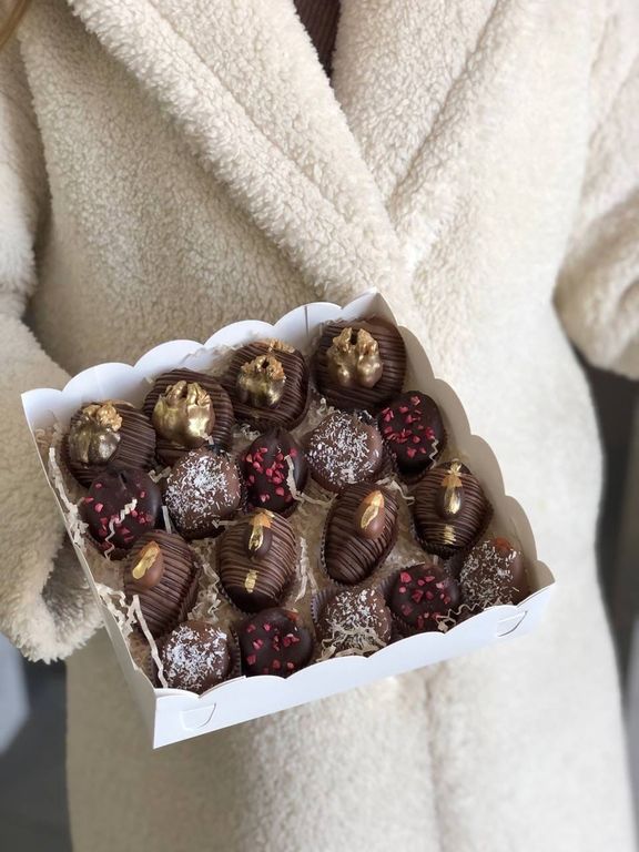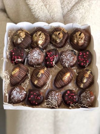 Сухофрукты в Бельгийском шоколаде: королевские финики, отборная курага, чернослив, инжир. Грецкий орех и миндаль.