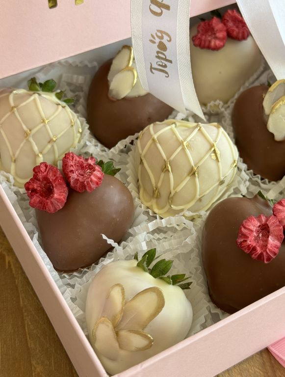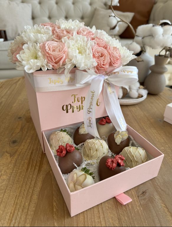 Кустовые розы, хризантемы и 9 отборных вкусных клубничек в бельгийском шоколаде.