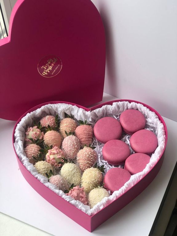 Бокс из спелой сочной клубники 12-15 (зависит от размера ягоды) штучек в белом и розовом клубничном бельгийском шоколаде и нежных пирожных макарунс не оставит Вас равнодушными!